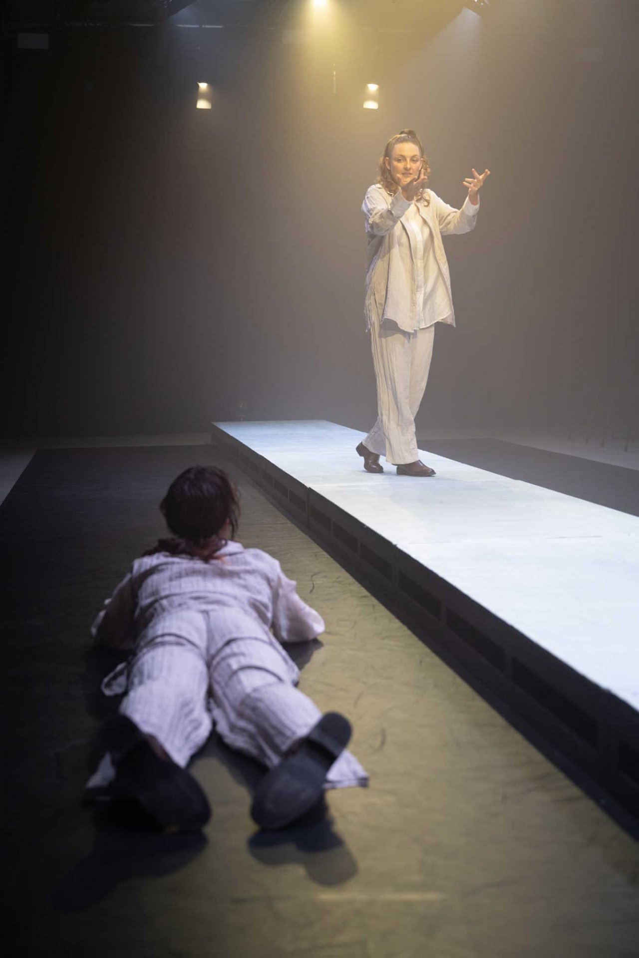 In der Inszenierung von frau emma gelb steht der Blick auf zwischenmenschliche Beziehungen, die Kraft der Selbstreflexion und die Auseinandersetzung mit den eigenen Taten im Mittelpunkt. Die Zuschauenden werden zu Objekten des Dramas, sie beobachten, werden beobachtet und müssen sich zu den Blicken der anderen verhalten.