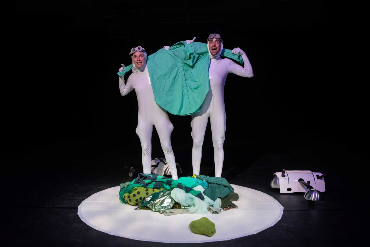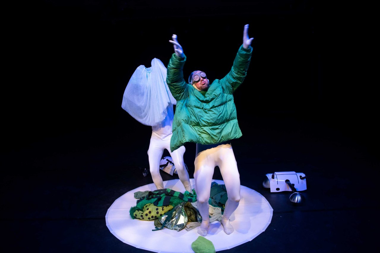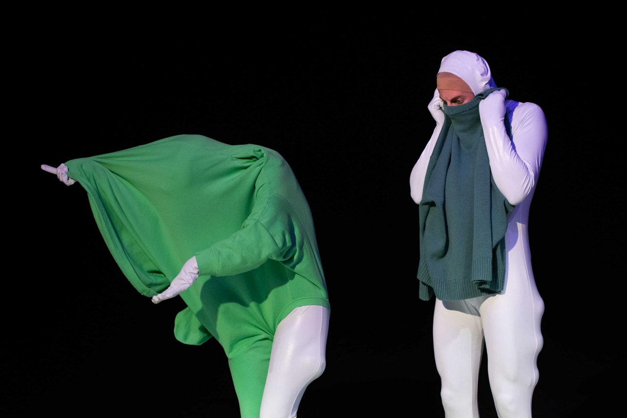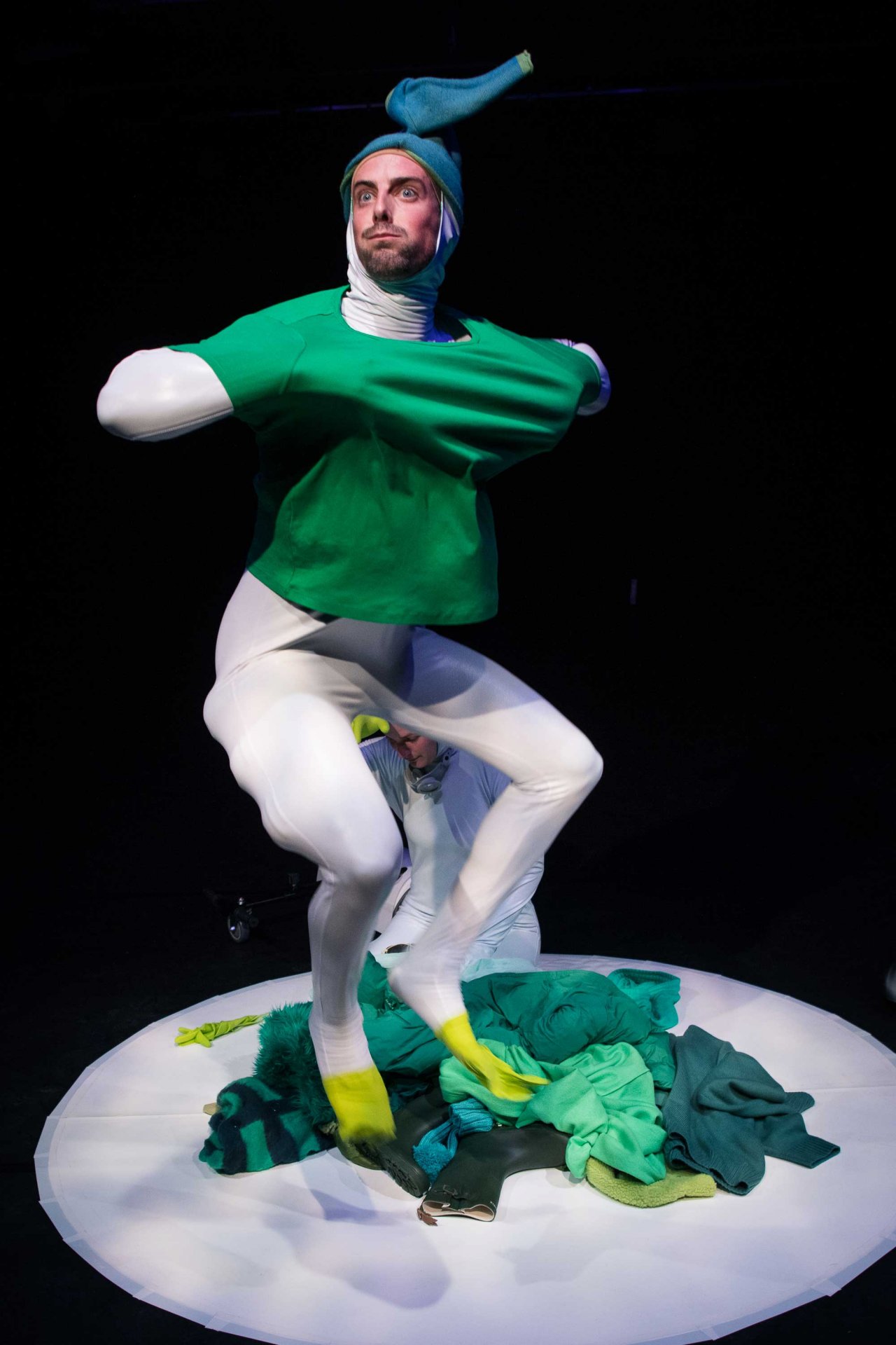 Was bin ich? Wer bin ich? Was kann ich sein? Poetisch und eigenwillig skurril werden Hürden des alltäglichen Anziehens erforscht und erweitern dabei spielerisch die Fantasieräume der kleinen aber auch der großen Zuschauenden.
