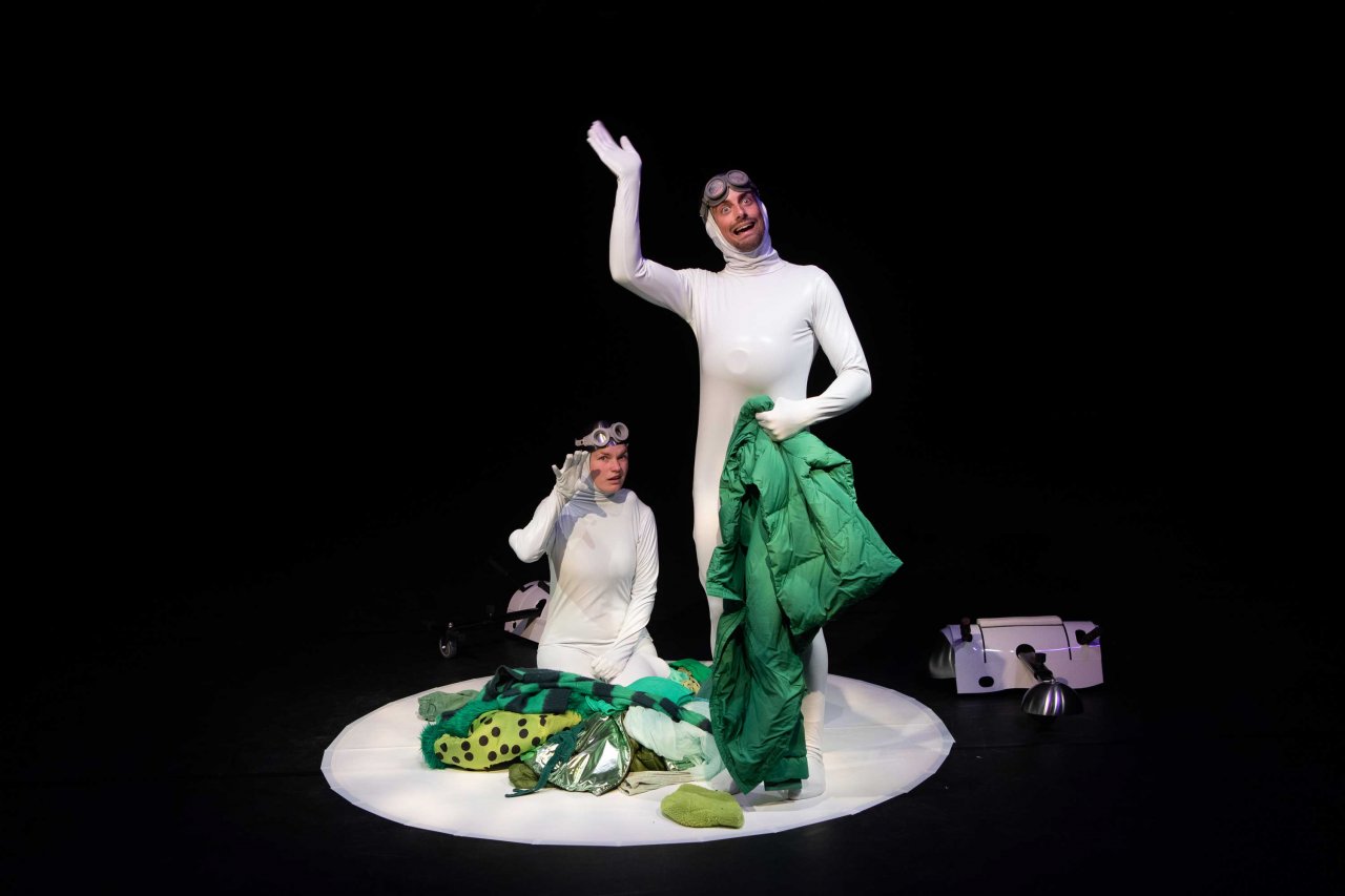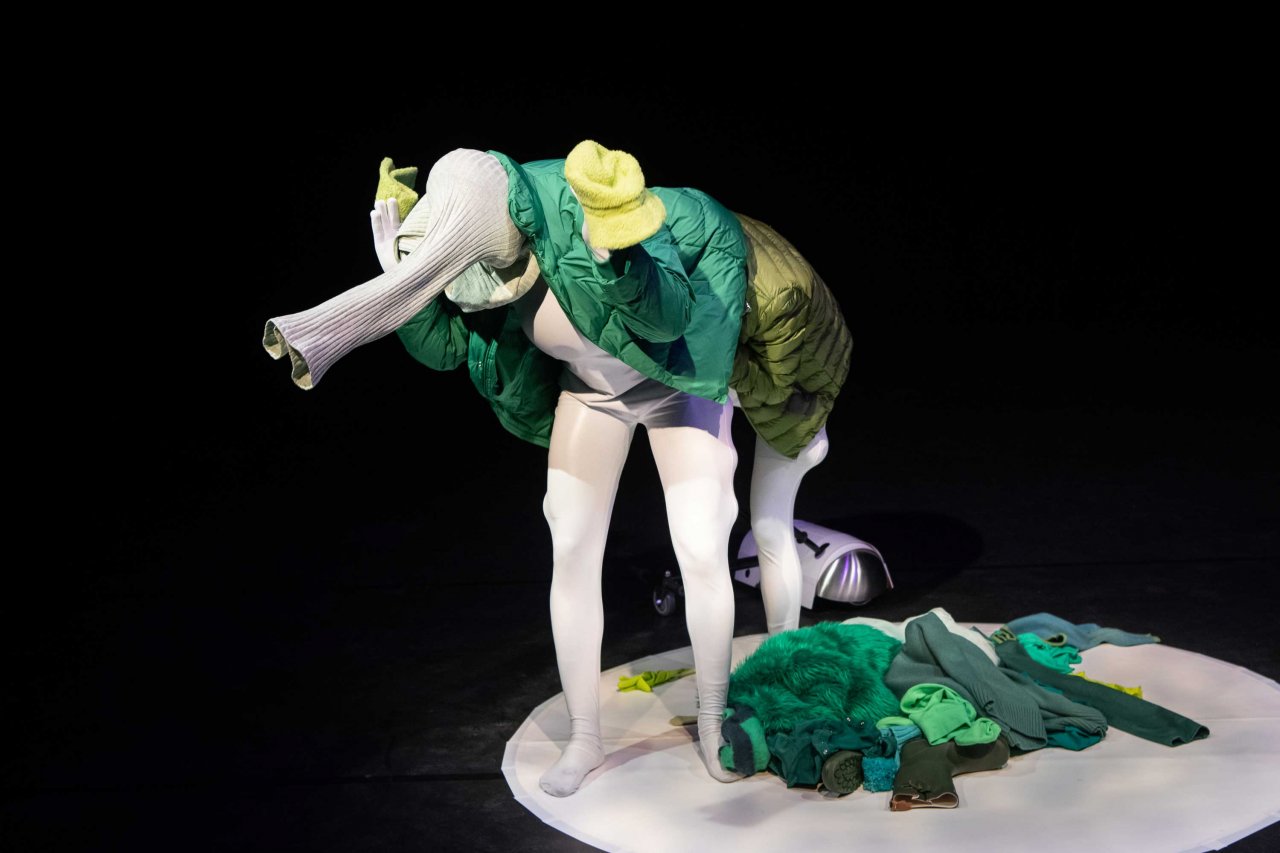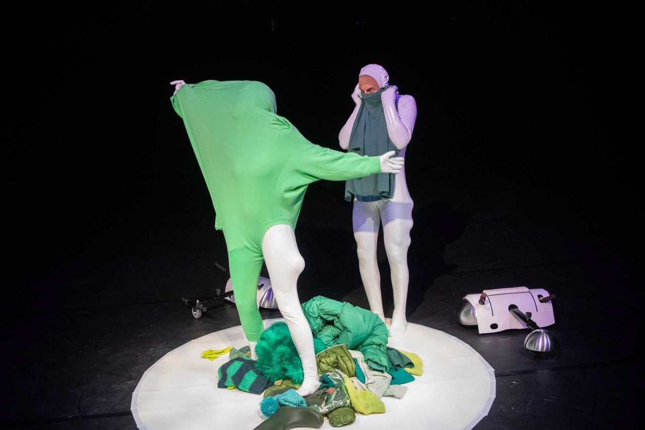 Was bin ich? Wer bin ich? Was kann ich sein? Poetisch und eigenwillig skurril werden Hürden des alltäglichen Anziehens erforscht und erweitern dabei spielerisch die Fantasieräume der kleinen aber auch der großen Zuschauenden.
